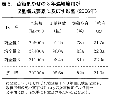2003年は標準区と箱全量区の2区,2004年は標準区と箱全量1年目区と同2年目区というように箱全量区を順次増やし,3年目の2005年は標準区と箱全量区の1,2,3年目の3区を設定した(以下,箱全量1区,同2区,同3区)。しかし,2005年は害虫が9月後半に異常発生し,この影響を受けて収量等が試験区によって大きく異なる結果となった。このため2006年に2005年と同様の設計として,再検討を行った。