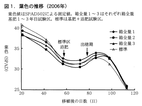 2006年の葉色推移を図1に示した。箱全量各区の減肥率は45%と目標設定を上回ったため,本田生育期前半の葉色値は標準区の葉色値よりもやや低いが,概ね標準区と同様の推移を示した。
