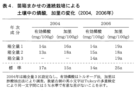 4年間にわたって検討を行ったが,中間年の2年目と最終年次の4年目の結果について紹介する。移植作業終了時の窒素成分の投入量は,計画の40%減肥に対して2年目は38%,4年目は45%であった。移植後の生育は前報(高橋 2007)でも報告したとおり,2か年共に肥効調節型肥料に特有な生育を示した。以下,2004年の結果(表1)も示しながら,箱全量連続施用の3年目までの結果が揃った2006年の結果を中心に述べる。