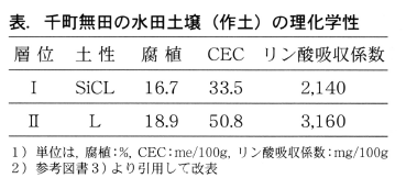 阿蘇くじゅう国立公園の高原を貫いて走る通称「やまなみハイウェイ」と呼ばれる観光道路がある。この沿線に”朝日台”という名所があり,ここが朝日長者の屋敷跡とされている。この高台から千町無田の盆地を見下ろすことができる。朝日台のドライブインの裏手にブルーベリィの小さな畑があり,その向こう側に山を削った土壌断面を見つけることができた。典型的な堆積火山灰土壌の断面である。A層には腐植が集積して黒ボク土壌の特徴を示している。千町無田は,これらの黒ボク土壌が低地に集まってできた湿地と考えられるので,黒ボク土水田地帯である。土壌分類では,「多腐植質黒ボクグライ土」に属し,その作土Ⅰ,Ⅱ層の理化学性は表に示したとおりである3)