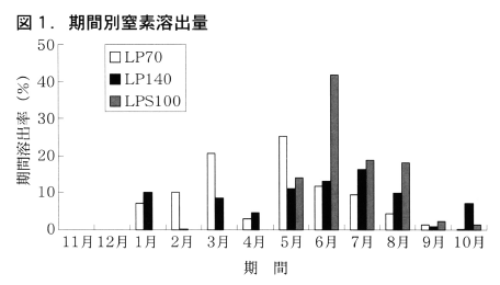 被覆尿素肥料からの窒素成分の溶出は温度に大きく影響され,地温が高い程窒素の溶出は進む。リニア型の溶出曲線を示すLPコート70(以下LP70),LPコート140(以下LP140)は11月の施肥1月後から窒素の溶出が始まり,その後は各資材の特性に応じて進行した(図1)。シグモイド型のLPSコート100(以下LPS100)は施肥後5ヶ月間はほとんど溶出せず,初夏~盛夏期に集中して窒素を供給した。
