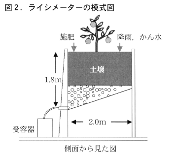 本試験で用いたライシメーターは図2のような構造である。一辺2mの正方形のコンクリートで仕切り,1.2mの深さまで砂壌土質の沖積土壌を充填した。それより低い位置には水はけを確保するために小石を敷き詰め,深さ1.8mの位置に排水口を設置した。かん水や降水により受容器に排水された浸透水中に含まれる硝酸態窒素を測定すれば,窒素流亡量が明らかにできる。