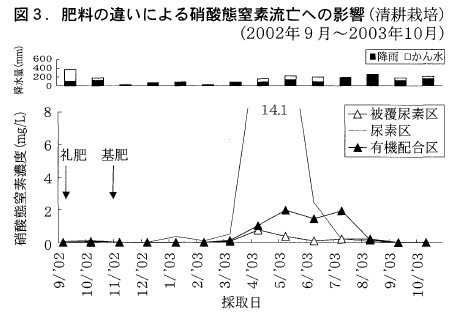 そこで,モモ樹を植栽しない更地状態のライシメーターを設定し,樹間部の施肥管理法を検討した。前年の2003年10月には有機配合肥料または尿素を施用後,2003年10月にLP70を施用した。その後,約1年間の硝酸態窒素の流亡について調査した。