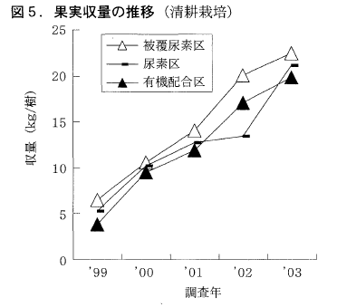 これは被覆尿素に含まれる窒素の利用効率が最も高く,施肥した窒素成分の吸収に無駄がないためと考えられた。その結果,果実収量も被覆尿素区で最も高かった(図5)。供試樹は幼木であったが,糖度等の果実品質は肥料資材間で大差なかった。