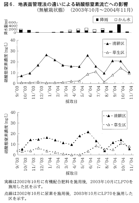 その結果,浸透水中の平均窒素濃度は1/2以下に低下した(図6の△)。吸収されずに土壌中に残っていた硝酸態窒素を草が吸収することで流亡するのを抑制したと考えられた。