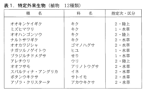 植物に対する「特定外来生物」の指定は,第一次指定で3種,第二次指定で9種,合計12種類が指定されました。大部分が水生植物で,陸上植物はオオキンケイギク,オオハンゴンソウ,アレチウリのみです。