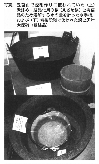 五箇山での作り方は,家の床下,囲炉裏の周りなどに深さ1~2mの穴を掘り,山野草と土を交互に積み重ね,年に3回,野草,カイコのふん,人尿などを加えながら鋤(すき)で上下を切り返すと,5年目から煙硝が採れるようになる。(住居環境は臭気で大変だったろう)。抽出はまず床下の土を土桶に入れ,水を加えて1夜おく。翌朝抜いた水は一番水と呼び,さらに水を加えて二番水を作り,次の抽出に使った。抽出後の残土はまた床下に戻し硝酸化成菌の摂取源とする。一番水は1石(180L)が3升(1升は1.8L)になる(3/100に)まで煮詰め,灰桶の灰(カリウム源)を通し,さらに1升5合まで煮詰める。煮詰めた液を木綿布に通して濾過し,1夜おくと砂のような「灰汁煙硝」が得られる。これを洗浄,再溶解,煮詰め,結晶化を繰り返し,中煙硝,上煙硝と精製してゆく。五箇山で実際に使われたプリミティーブな鍋などの写真をみると,作業した人たちの苦労がしのばれる(写真)。