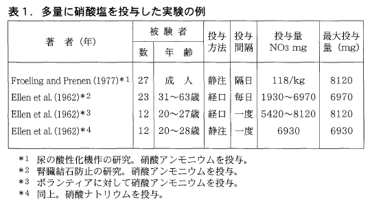 硝石の薬としての効果についてはその後,あまり期待できるものではない,まったく効果がないなどという報告が次第に多くなった。ただこの間には尿の酸性化機作の研究,腎臓の結石防止などの研究目的で大量の硝酸塩を投与した実験が行われていた。その例は表1に示すが,効果のほどは明らかでないが有害性は認められず,わずかにEllen et al.*3の試験で被験者12名中1名が嘔吐,1名が下痢を報告している。8gもの硝酸アンモニウムを経口的に摂取すれば無理もない気がする。薬としての効果はともあれ,少なくとも相当多量に経口摂取や静脈注射をしても著しい害はなかったことが注目される。
