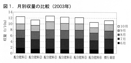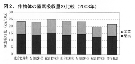 慣行栽培区については,県基準に従い基肥に燐硝安加里S604+油粕(N:25kg/10a),追肥に燐硝安加里S646+油粕(N:3kg/10a×5回)を施用した。なお,本試験における施肥方法は,畦全面に表層施肥した後,作土深20cmで土壌混和した。