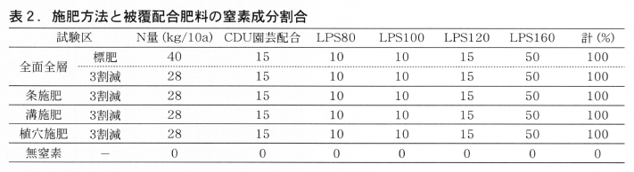 前述の配合比率の被覆肥料を用いた全量基肥施肥の効果的な施肥位置として,全面全層施肥,条施肥,溝施肥,植穴施肥について,最も肥効が向上する施肥法を検討した。