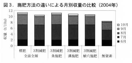 栽培試験の結果を図3,表3に示した。条施肥は3割減肥でも全面全層施肥の標準施肥量と同等の収量が得られ,作物体の窒素吸収量および見かけの施肥窒素利用率が最も高かった。