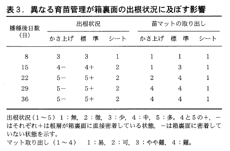 播種後36日目に手作業による箱裏面の根層の除去試験を行ったが,標準区で1枚当たり平均38秒,かさ上げ区は同27秒を要した。かさ上げ区は根層が箱裏面に密着していないため除去しやすく,作業性の面からも標準区より優れていた。