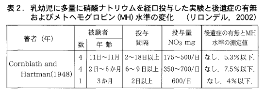 当然,このメトヘモグロビン血症については再現試験が注目されるが,3か月以内の乳児にしか発生しないという制約があり,人道的には乳児を直接的な対象とした実験は難しい。ところが実際にはそのような実験が行われていた。Cornblathら(1948)はNO3-Nとして1000mg/Lという驚くべき高濃度の「人工井戸水」を小児科病棟の乳児に与え,メトヘモグロビン水準(全ヘモグロビン中のメトヘモグロビンの比率)を測定した。この値が10%以上となれば,メトヘモグロビン血症が肉眼的に観察できる濃度とされているが,表2にみるように,日投与量が500~700mg/日であってもメトヘモグロビン水準は10%を越えることはなく,乳児には肉眼的な影響はなかった。後遺症も報告されていない。