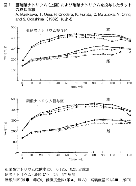 直接発ガン性を否定する実験は日本で行われていた。国立衛生試験所(Maekawa et al.,1982)ではガンを発生しやすい系統のラット(F-344)300頭を使い,雌雄別に飼料中に2.5および5%硝酸ナトリウムを加えて2年間飼育し,実験後すべてのラットを解剖して発ガン性について調べた。発ガン性(睾丸,乳腺,下垂体,腎臓,肝臓,甲状腺,子宮など)は認められず,むしろ造血器官における腫瘍(単核細胞白血病)の発生は硝酸塩の給与で有意に減少した。さらにかれらは亜硝酸ナトリウムを飲水に0.125および0.25%添加して与え,やはり2年間飼育し,解剖した。結論はまったく硝酸ナトリウムの場合と同じで発ガン性は認められず,むしろ単核細胞白血病の発生は抑制された。