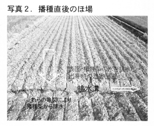 播種は,愛知県農業総合試験場においてイネ用に開発された不耕起V溝播種機(写真1)を用いた。この播種機は播種前の整地が必須であり,本試験においては愛知県で開発した浅耕鎮圧機による整地を行った。また,排水溝は播種条に滞水するのを避けるため,約25m間隔で播種方向と直交に施工した(写真2)。