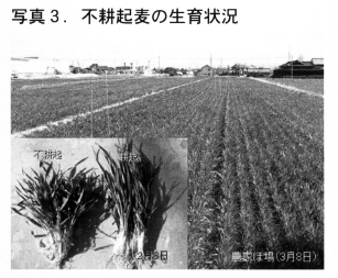 一方,2004年8月に愛知県奨励品種に採用されたイワイノダイチは早生品種であるが,茎立ちが遅く凍霜害にあいにくいため,従来の主力品種である農林61号より早い11月中旬に播種できる。イワイノダイチと不耕起栽培を組みあわせれば10月播種が可能であり,大規模農家にとって,播種期間が拡大でき作業分散が可能になること,収穫が梅雨前になるため品質向上が期待できること等,不耕起栽培導入のメリットがあると考えられる。