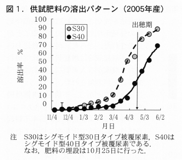 供試肥料の溶出量ピーク時が,それぞれ3月上中旬と4月中旬で,S30は穂肥肥効,S40は実肥肥効の溶出パターンであると考えられ,試験1におけるS30は収量に対する効果が大きく,S40は蛋白質含量向上効果が大きい結果となった。一方,S40のみの4kg施肥については外観品質を著しく低下させることから,実用的でないと判断した。