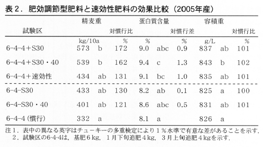 肥効調節型肥料の播種同時同条施肥では出芽及び初期生育に対する障害はみられず順調な生育を示した。S30区およびS40区の稈長・穂長は無処理区に比べ長く,穂数は多かった。収量はS30区が464kg/10aと最も多く,蛋白質含量はS40区が10.0%と最も高かった。外観品質はS30区が2.8,S40区が3.2と慣行に比べ劣った(表1)。