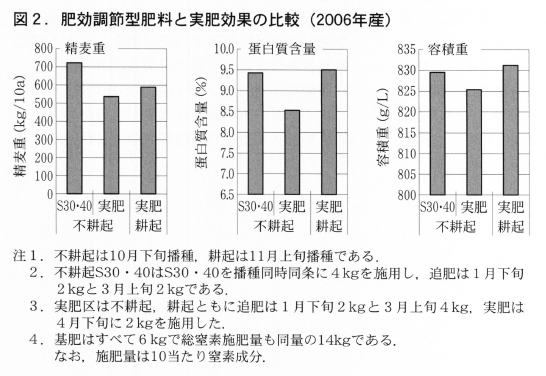 以上のことから,不耕起V溝播種機を用いて,LPS30:LPS40(1:1)を播種同時同条施用するコムギ不耕起栽培は,高品質安定生産に極めて有効な施肥方法であると結論された。