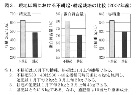 耕種概要は,品種イワイノダイチ,不耕起栽培が播種10月25日,出穂期4月15日,成熟期6月7日,耕起栽培が播種11月4日,出穂期4月22日,成熟期6月11日である。