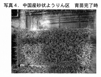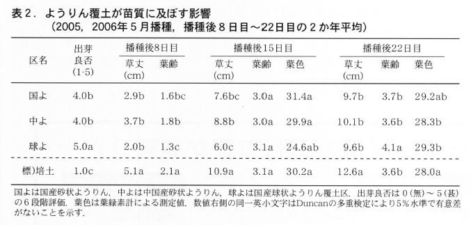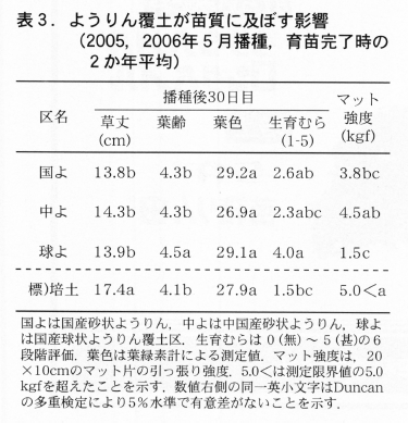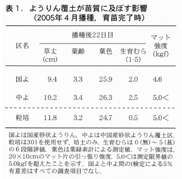 2005年4月播種では国産と中国産の砂状ようりん両区の間に有意な差は認められなかった。しかし,草丈やマット強度などで国産砂状ようりん区は中国産砂状ようりん区をやや下回る傾向にあった。粒状培土区との比較では両区共に出芽状況は劣ったが,播種後22日目の時点では生育に大きな差は認められなかった(表1)。