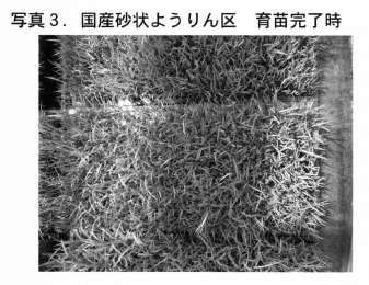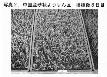 砂状ようりんは国産,中国産区共に出芽時に生育障害を受けた個体が多く,生育むらが発生した。生育むらの状況は個々の反復によっては国産砂状ようりん区がむしろ大きい場合もみられた(写真1,2) 。