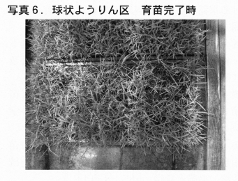 草丈は標準区より劣ったが葉齢,葉色に有意な差はなかった。球状ようりんは,出芽時から生育障害が激しく白化苗も多発し,生育むらは最後まで回復しなかった(表2,3および写真6)。