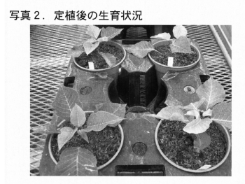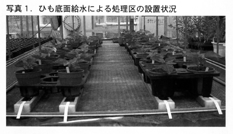 2004年8月2日に,発根苗を5号サイズのプラスチック鉢に定植し,活着後の8月10日からひも底面給水を開始した(図1,写真1,写真2)。
