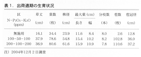 肥効調節型肥料施用区と液肥区の出荷適期の草丈,株径及び苞数とも同程度であり,有意差は認められなかった(表2,写真4)。