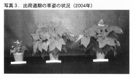 出荷適期の生育は,草丈,分枝数では液肥施用濃度がN-P2O5-K2Oの成分で100-50-100(ppm)区が優れた。一方,葉数,株径,苞数,苞冠径では200-100-200(ppm)区が優れたが,濃度障害と考えられる苞縁の枯れ込みや株バランスの崩れが見られた。このため,商品性から判断して100-50-100(ppm)区が最も良いと判断した(表1,写真3)。