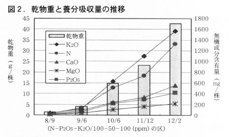 液肥の施用濃度が,無施用(対照),N-P2O5-K2Oの成分で,100-50-100(ppm),200-100-200(ppm)となる3区を設定し,1ヶ月ごとに植物体に含まれる無機成分含有量を調査した。