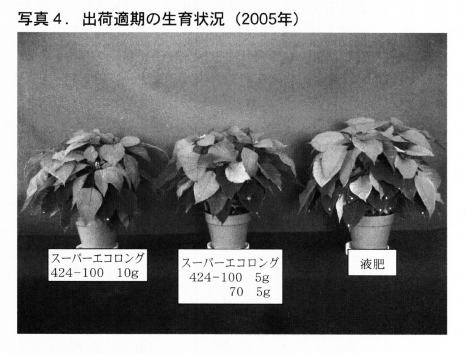 以上の結果から,ポインセチアでは,発根苗を8月上旬に5号鉢へ定植する時点でスーパーエコロング424-100を鉢当たり10g施用することで,5号鉢の規格品として十分な品質が得られ,また,施肥作業は1種類の肥料を1回施用で済むことから省力栽培にもつながることが明らかになった。