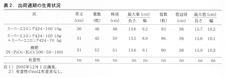 しかし,2区のスーパーエコロング424-100を5g+スーパーエコロング424-70を5g追肥では,苞葉の色づきが劣る傾向が見られ,生育初期の養分不足が原因と考えられた。