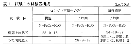 試験区の構成は表1に示したとおりであり,樹冠上に施用する樹冠上施肥区,うね間に施用するうね間施肥区の2区を設けた。
