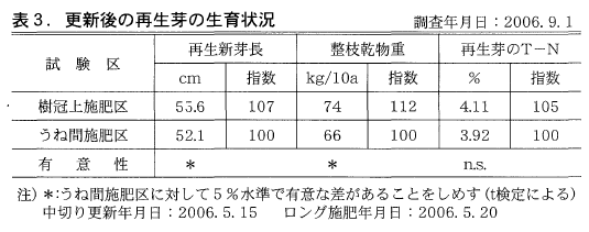 表3に更新後105日目の再生芽の生育状況を示した。再生芽長は樹冠上施肥区55.6cm>うね間施肥区52.1cm,整枝乾物重は74kg/10a>66kg/10aと樹冠上施肥区の生育がうね間施肥区に比べ有意に良好であった。また再生芽のT-N含有率でも樹冠上施肥区が高かった。