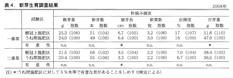 表4に新芽の生育調査結果を示した。中切り更新から2年目を迎える2008年の一番茶新芽は,樹冠上施肥区が摘芽長,百芽重でうね間施肥区を有意に上回った。