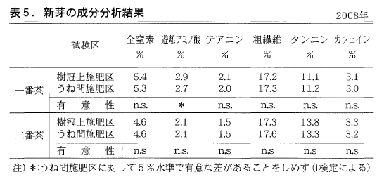 表5に2008年の一,二番茶新芽の成分分析結果を示した。一番茶新芽では遊離アミノ酸含有量で樹冠上施肥区とうね間施肥区の間に有意な差が認められたが,全窒素,テアニンなどでは差が認められなかった。