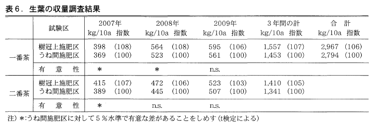 表6に生葉収量調査の結果を示した。一番茶では2007年,2008年に樹冠上施肥区とうね間施肥区で有意な差が認められた。二番茶においては2007年のみ差が認められた。