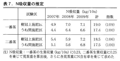 表7に生葉収量,全窒素含有量から試算した一,二番茶によるN吸収量を示した。一番茶のN吸収量は,生葉収量,全窒素含有量を反映し,樹冠上施肥区がうね間施肥区に比べ試験期間を通じ多かった。二番茶においても同様な傾向であったが,その差は一番茶ほどではなかった。このようにN吸収の面からも中切り更新後の樹冠上施肥がうね間施肥に比べ効果が認められた。