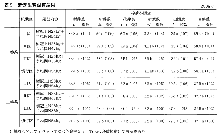 Ⅲ区はほとんどの項目が慣行区と同等であった。新芽の生育状況はー,二番茶ともに概ねN施肥量が多いⅠ区が最も良好であり,次にⅡ区となり,施肥量が最も少ないⅢ区は慣行区と同等であった。