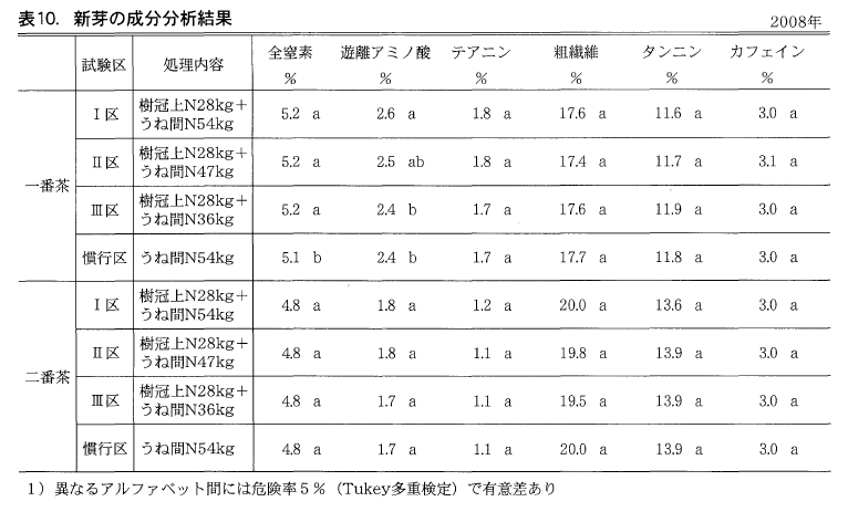 表10に2008年の一,二番茶新芽の成分分析結果を示した。一番茶ではⅠ,Ⅱ,Ⅲ区の全窒素含有率で,またⅠ区の遊離アミノ酸含有率で慣行区と有意な差が認められた。
