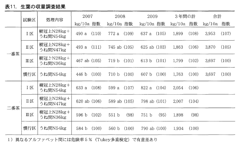 3年間を通じた生葉収量は樹冠上施肥区がうね間施肥区よりも一番茶で平均35kg/10a,二番茶でも平均23kg多く,樹冠上施肥区がうね間施肥区に対して収量の面からも効果が認められた。しかし,その効果は年を経るごとに減少の傾向が