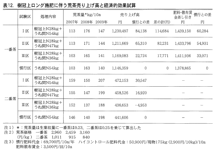 中切り更新後の樹冠上ロング施肥に伴う経済的効果を試算した。荒茶量は生葉収量に一番茶は0.23,二番茶は0.25を乗じて求めた。荒茶価格は生葉の茶工場での加工後の販売価格を利用した(2007年一番茶2,960円/kg,二番茶1,011円,2008年一番茶2,459円/kg,二番茶915円, 2009年一番茶3,160円/kg,二番茶840円)。慣行施肥の肥料代金は69,700円/10a/年,ロングの肥料代金は50,900円/現物175kg(2,900円/10kg),樹冠上施肥作業賃金は3,500円/1回/10aで試算した。