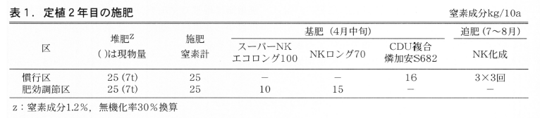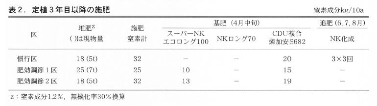 定植1年目は土作りを目的に堆肥を30t/10a施用後,化成肥料で10a当たり窒素成分10kgを施用し(以後,堆肥,化成肥料は10a当たりの窒素成分量とする),定植2年目以降は化成肥料と堆肥を合わせた施肥量を50kgとし,比率を変えて検討した。