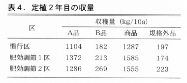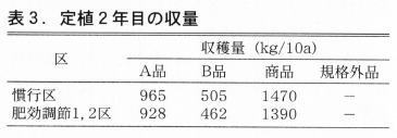 A品収量は両区とも0.9t/10a,商品収量は約1.4tとなった(表3)。