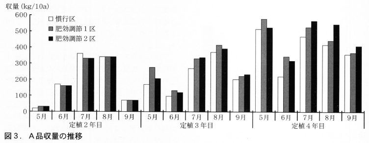 肥効調節区は7月の収穫ピーク時の収量がやや劣り(図3),生育前半の施肥法の再検討が必要と考えられた。