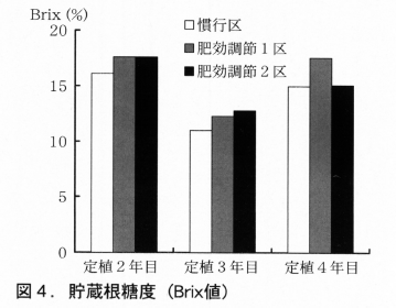 越冬前の貯蔵根の糖度は,肥効調節1区,2区ともに慣行区と同程度~やや高い傾向がみられ(図4),定植5年目の春以降も慣行と同等かそれ以上の収量が期待できると見込まれた。
