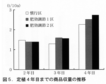 施肥法による収量差は定植3年目の春から見られ(図3),定植4年目までの商品収量は肥効調節区が高く推移した(図5)。この理由として,5月から6月の春芽収量は越冬前の貯蔵根のBrix糖度が高かっため,7月以降の夏秋芽収量は土壌と堆肥の間に施用した肥料が効率的に吸収,利用されたためと推察された。