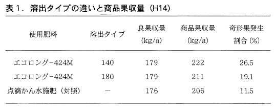 リニア型の溶出特性をもつエコロング-424Mを用い,140,180の溶出タイプについて検討したところ,どちらも同等の収量であった。しかし,140タイプでは奇形果の発生が増加したことから,180タイプが適した(表1)。