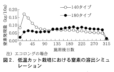 低温カット栽培における窒素の発現量をシミュレーションしたところ,140タイプでは初期の溶出量が多くなることから,生育初期の窒素過多により奇形果の発生が助長されたものと推察された(図2)。